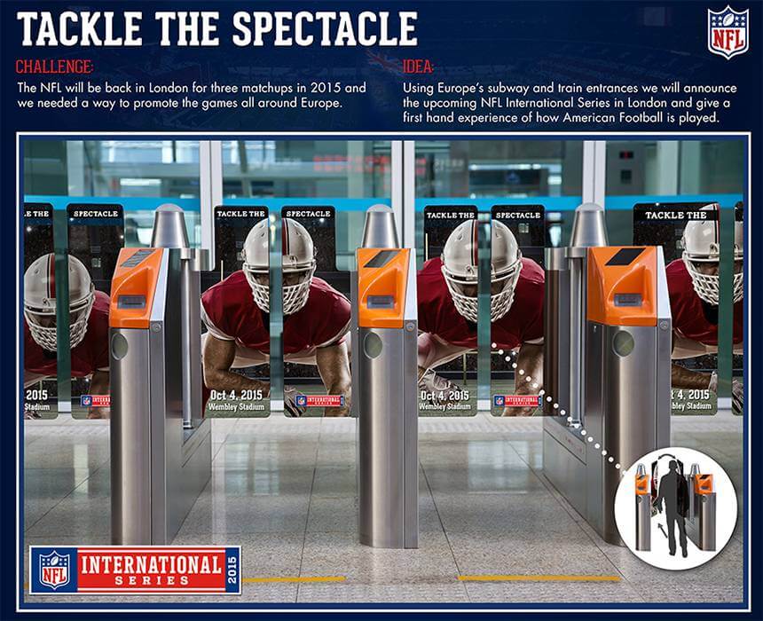 New York graduates Chatterjee and Limon wowed the judges by incorporating interactivity into non-digital transit advertising with NFL International Tackle the Spectacle, promoting the National Football League’s International Series to unsuspecting London commuters.